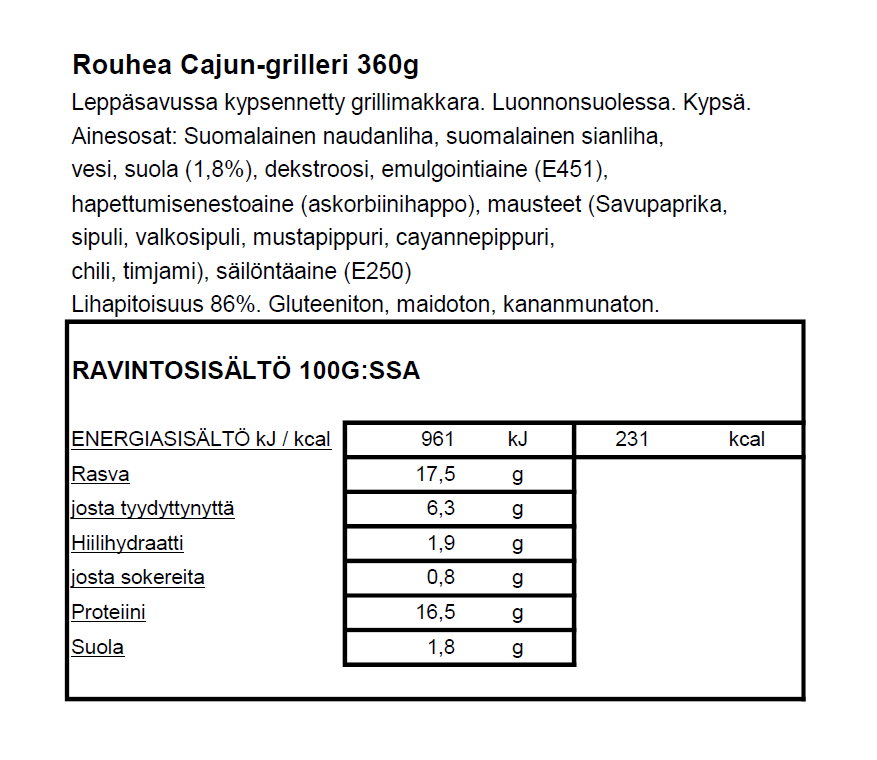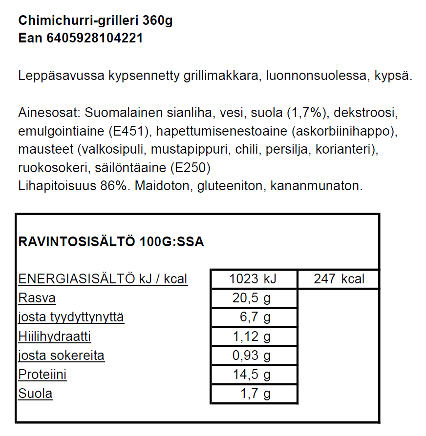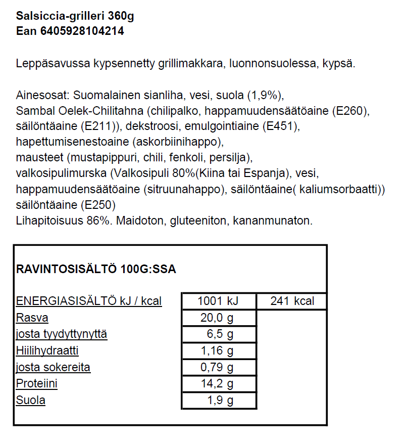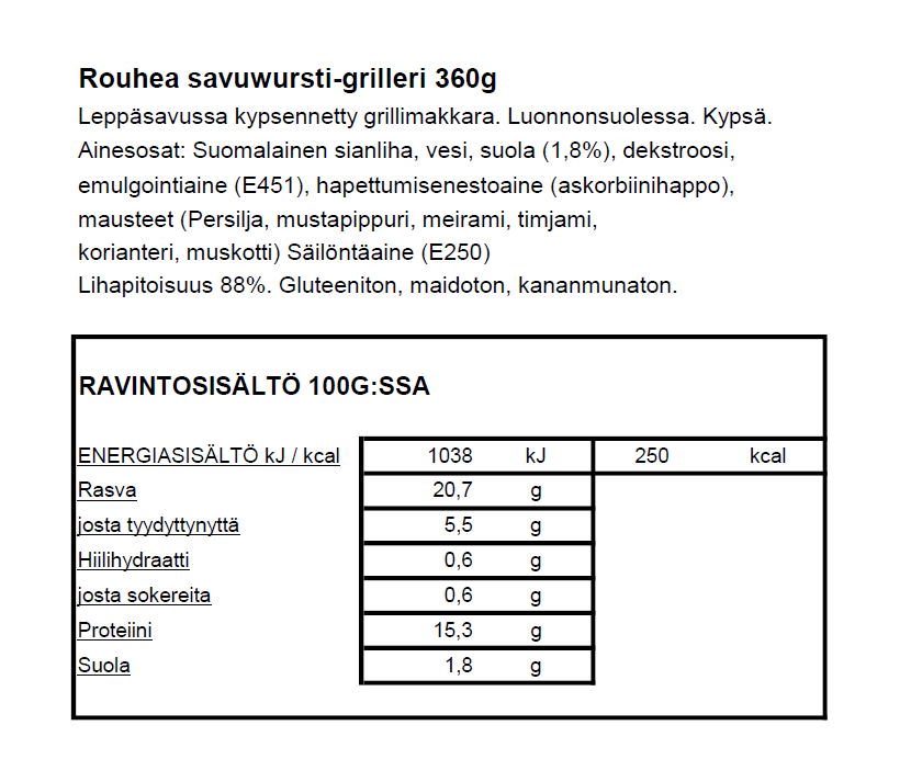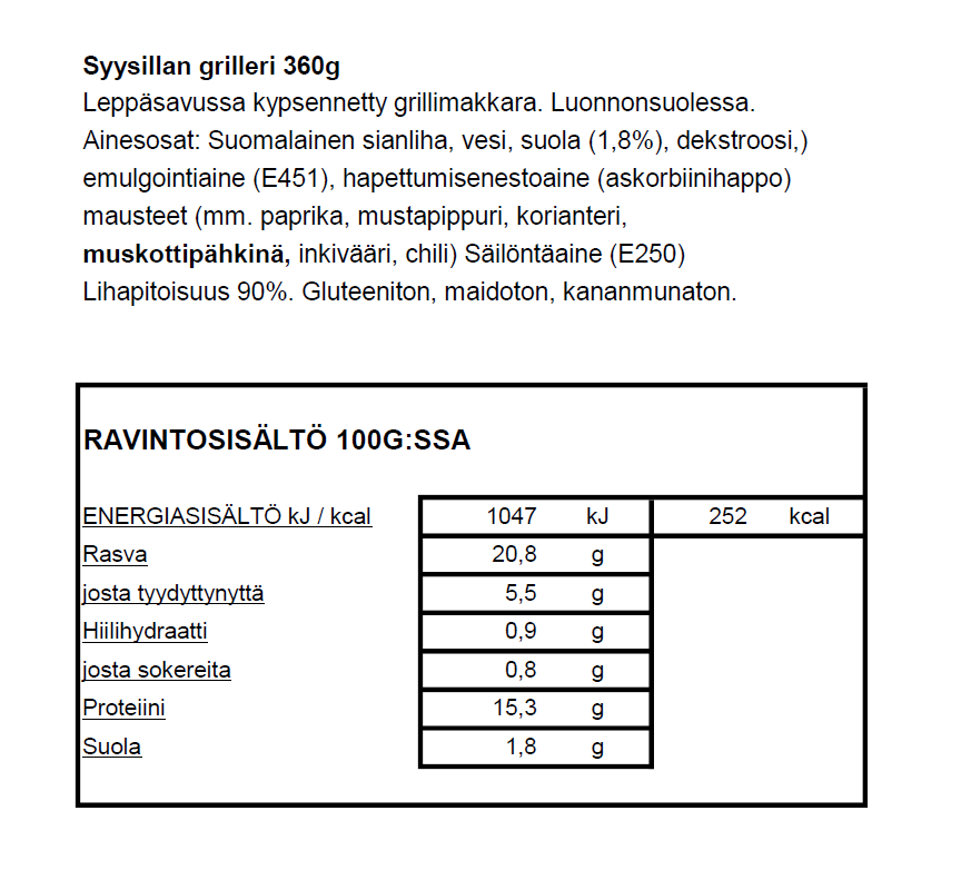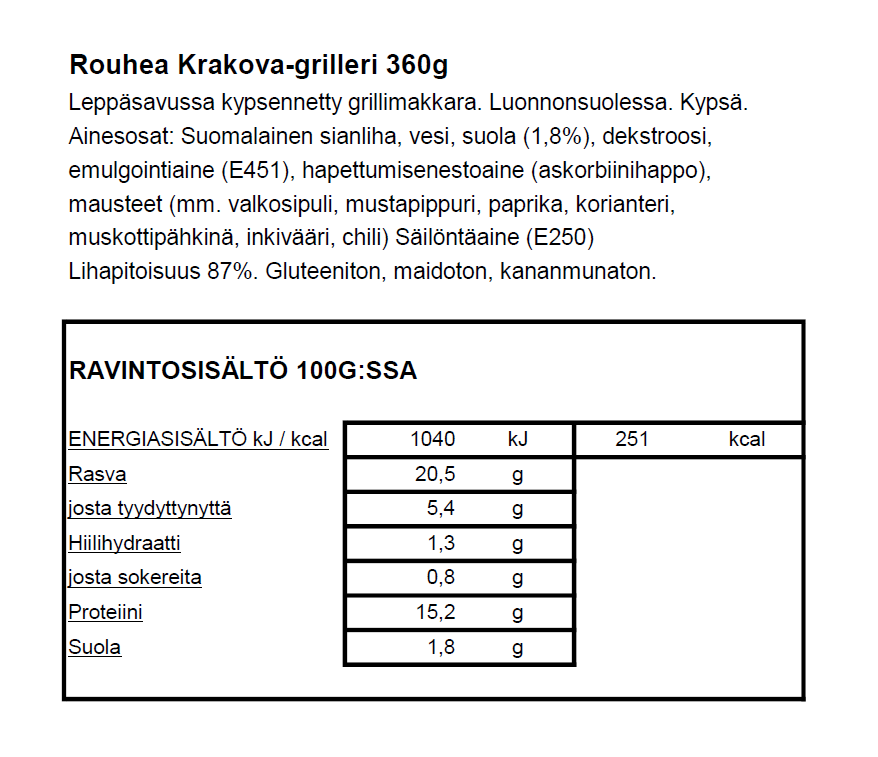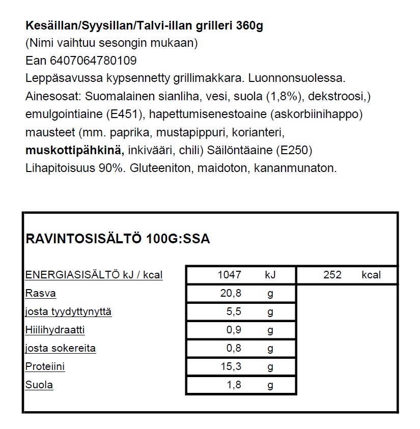 Kaikki makkarat ja nakit ovat täyslihamakkaroita ja gluteenittomia ja ne valmistetaan ainoastaan kotimaisesta lihasta.